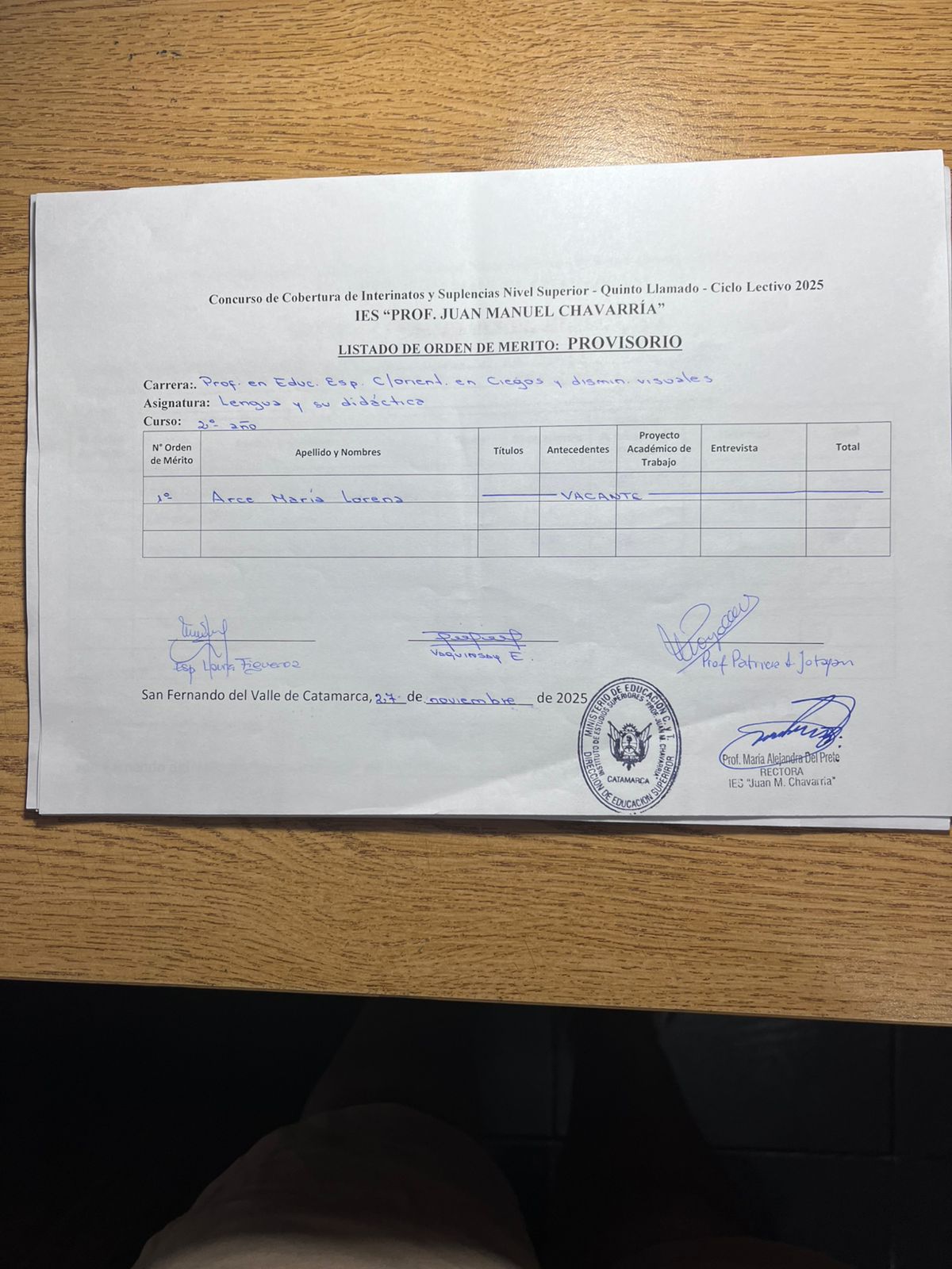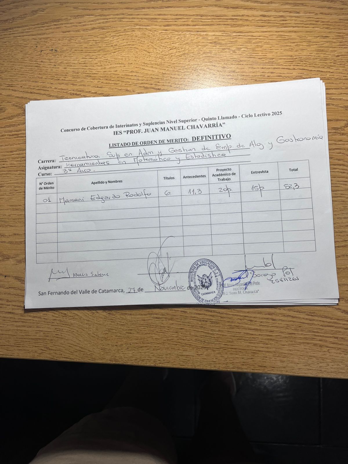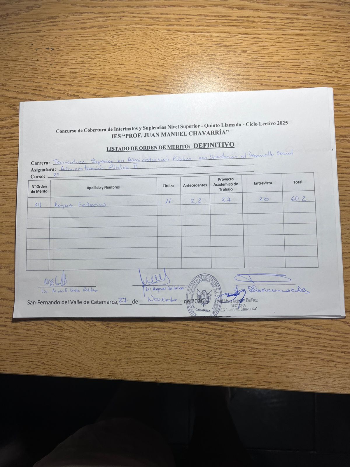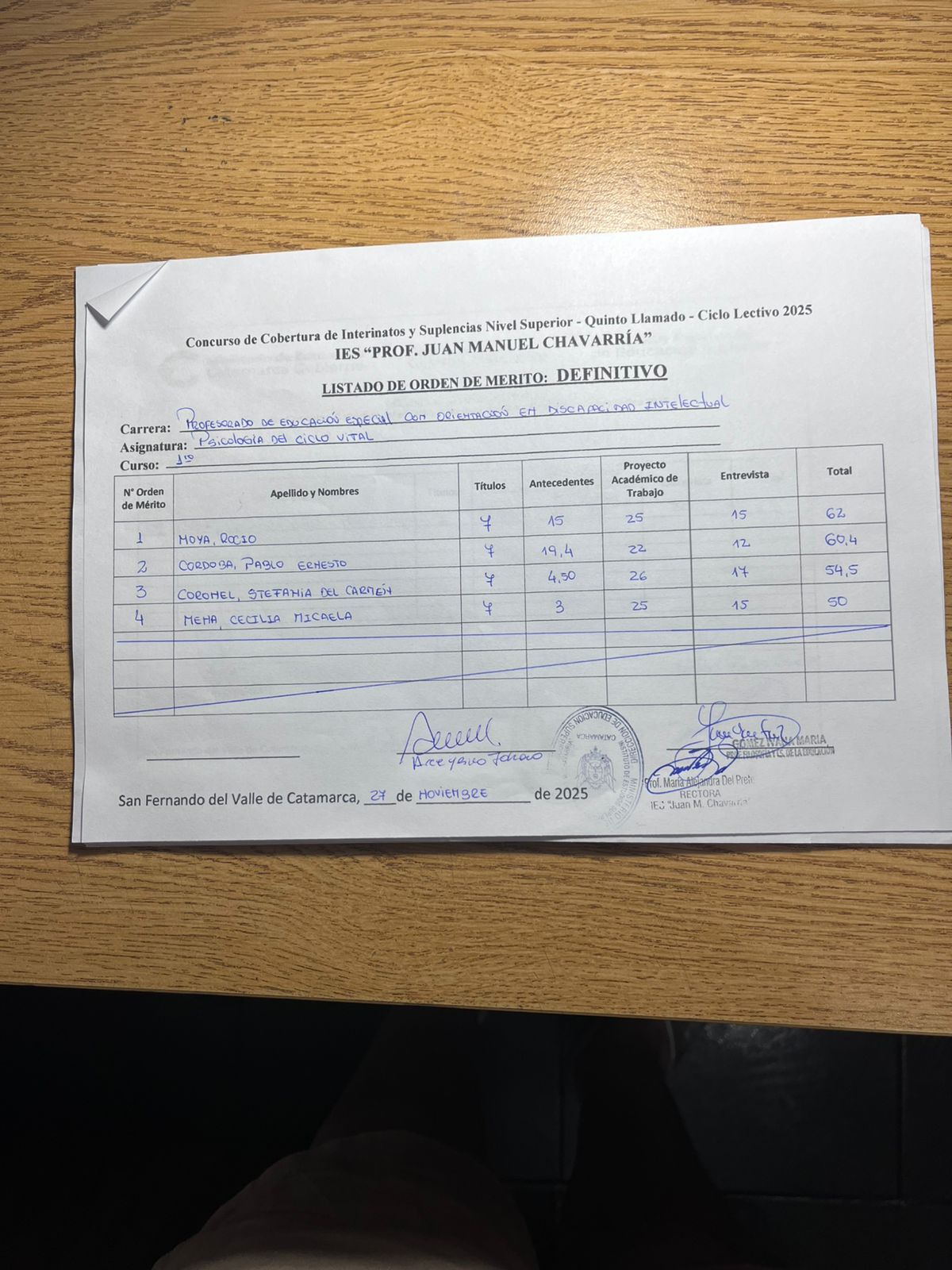 Listado de Orden de Mérito definitivo del 1er Concurso para cobertura de cargos del nivel superior IES “Prof. Juan Manuel Chavarría”
